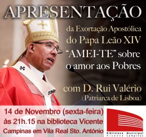 O patriarca de Lisboa, D. Rui Valério, vai apresentar a exortação apostólica ‘Dilexi Te’ (Eu amei-te, em português), sobre o cuidado da Igreja pelos pobres e com os pobres, no dia 14 de novembro, a partir das 21h15, na Biblioteca Municipal de Vila Real de Santo António, informa o jornal diocesano ‘Folha do Domingo’.