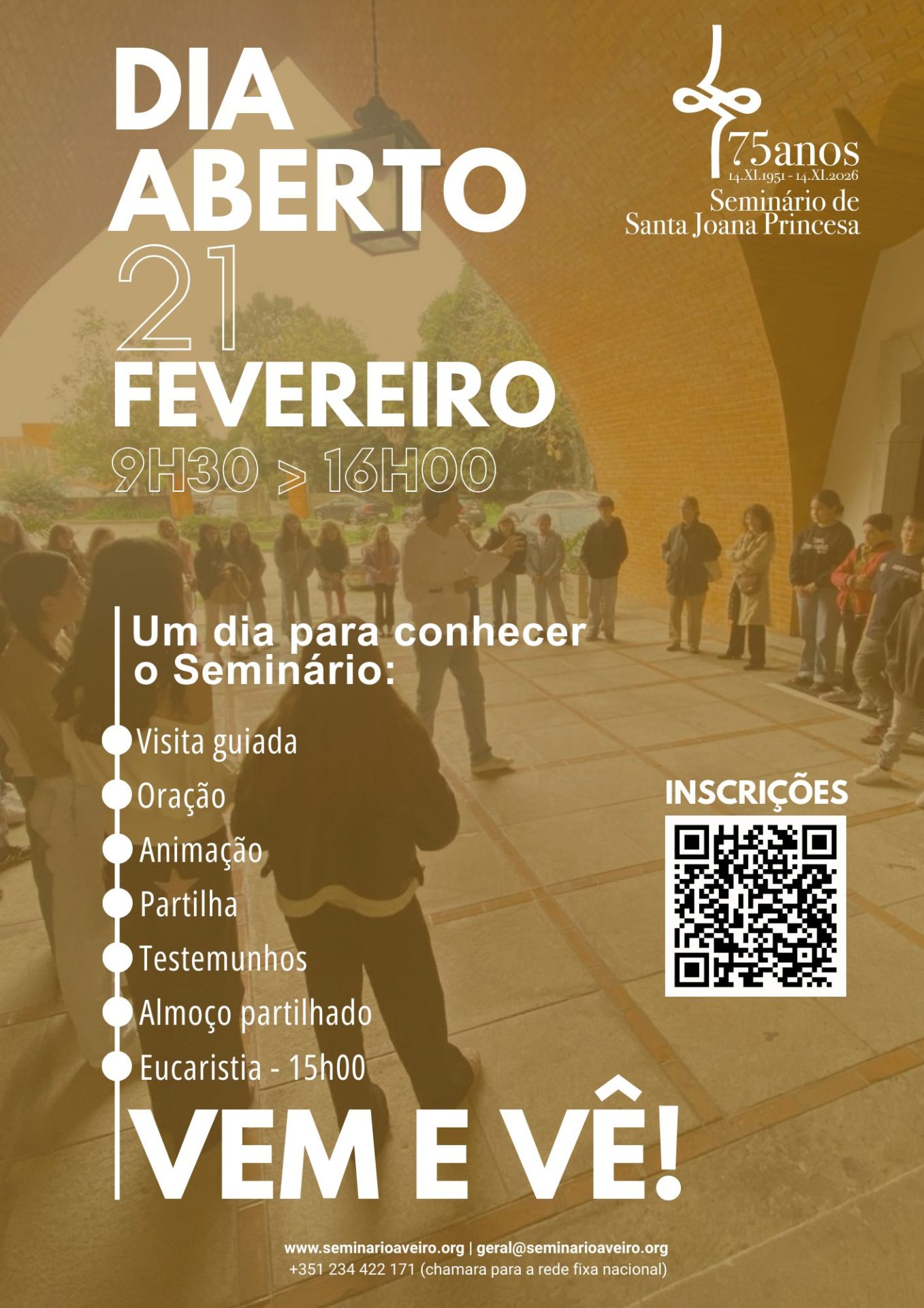 As inscrições para este ‘dia aberto’ do Seminário de Santa Joana Princesa podem ser feitas através de um formulário acessível pelo código QR presente no cartaz, diretamente na página do Seminário Diocesano na internet – www.seminarioaveiro.org, pelo endereço de correio eletrónico (email geral), ou pelo número de telefone 234422171.