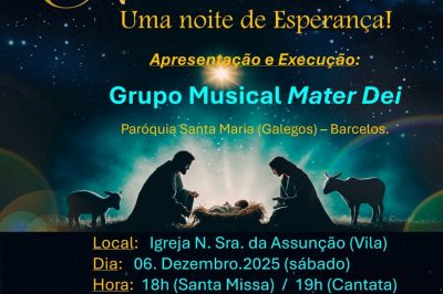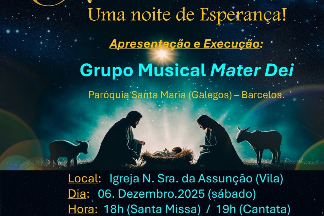 Bragança, 02 dez 2025 (Ecclesia) – A Paróquia de Nossa Senhora da Assunção, em Vinhais, integrada na Unidade Pastoral Senhora da Encarnação (Diocese de Bragança-Miranda) vai promover, dia 06 deste mês, uma cantata Natalina assente no tema “Uma Noite de Esperança!”.