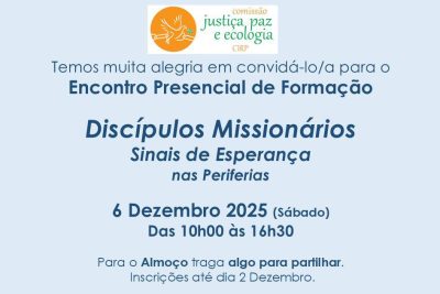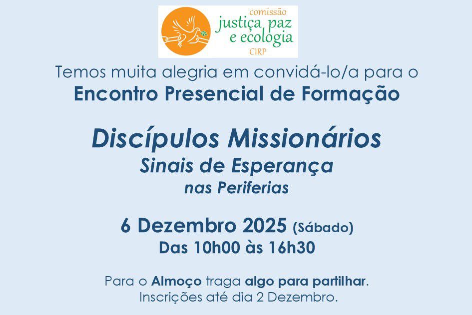 Lisboa, 02 dez 2025 (Ecclesia) – A Comissão Justiça, Paz e Ecologia da CIRP (Conferência dos Institutos Religiosos de Portugal) promove, dia 06 deste mês, entre as 10h00 e as 16h30, um encontro presencial de formação sobre «Discípulos Missionários: Sinais de Esperança nas Periferias».