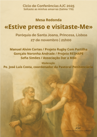 Lisboa, 13 nov 2025 (Ecclesia) – A Associação de Juristas Católicos (AJC) promove uma mesa redonda sobre acompanhamento a pessoas privadas de liberdade, do ciclo ‘Soltaste as minhas amarras’, às 21h00, do dia 27 de novembro, na Paróquia de Santa Joana, Princesa, em Lisboa.