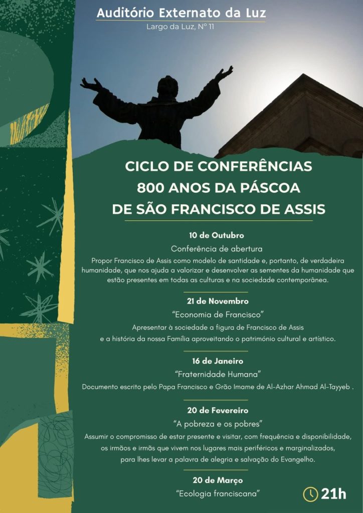 O ciclo de conferências dos 800 anos da Páscoa de São Francisco de Assis vai realizar-se entre este mês de outubro e março de 2026, ao ritmo de um encontro por mês, exceto dezembro, às 21h00, no auditório do Externato da Luz, no Largo da Luz (11), em Lisboa.