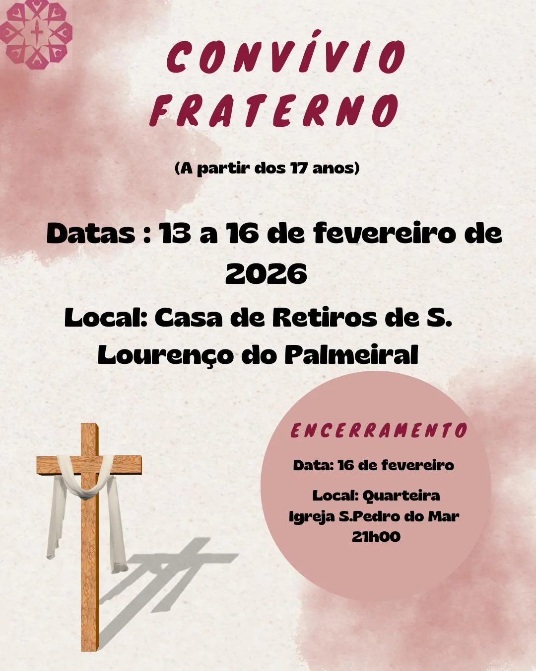 Este Convívio Fraterno vai começar às 19h30 desta sexta-feira, realiza-se de 13 a 16 de fevereiro, na Casa de Retiros de São Lourenço do Palmeiral, em Pêra (Silves).