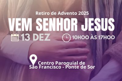 Portalegre, 09 dez 2025 (Ecclesia) – O Renovamento Carismático da Diocese de Portalegre-Castelo Branco promove, dia 13 deste mês, um dia de recoleção de Advento, subordinado ao tema «Vem Senhor Jesus», no Centro Paroquial de São Francisco, na cidade de Ponte de Sor.