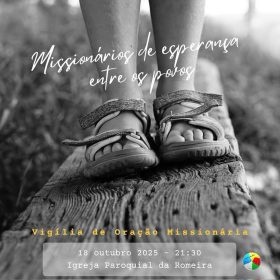 Santarém, 18 out 2025 (Ecclesia) – O Secretariado da Ação Missionária da diocese de Santarém, promove hoje uma vigília de oração, na igreja de São Brás, na Romeira, concelho de Santarém, pelas 21h30.