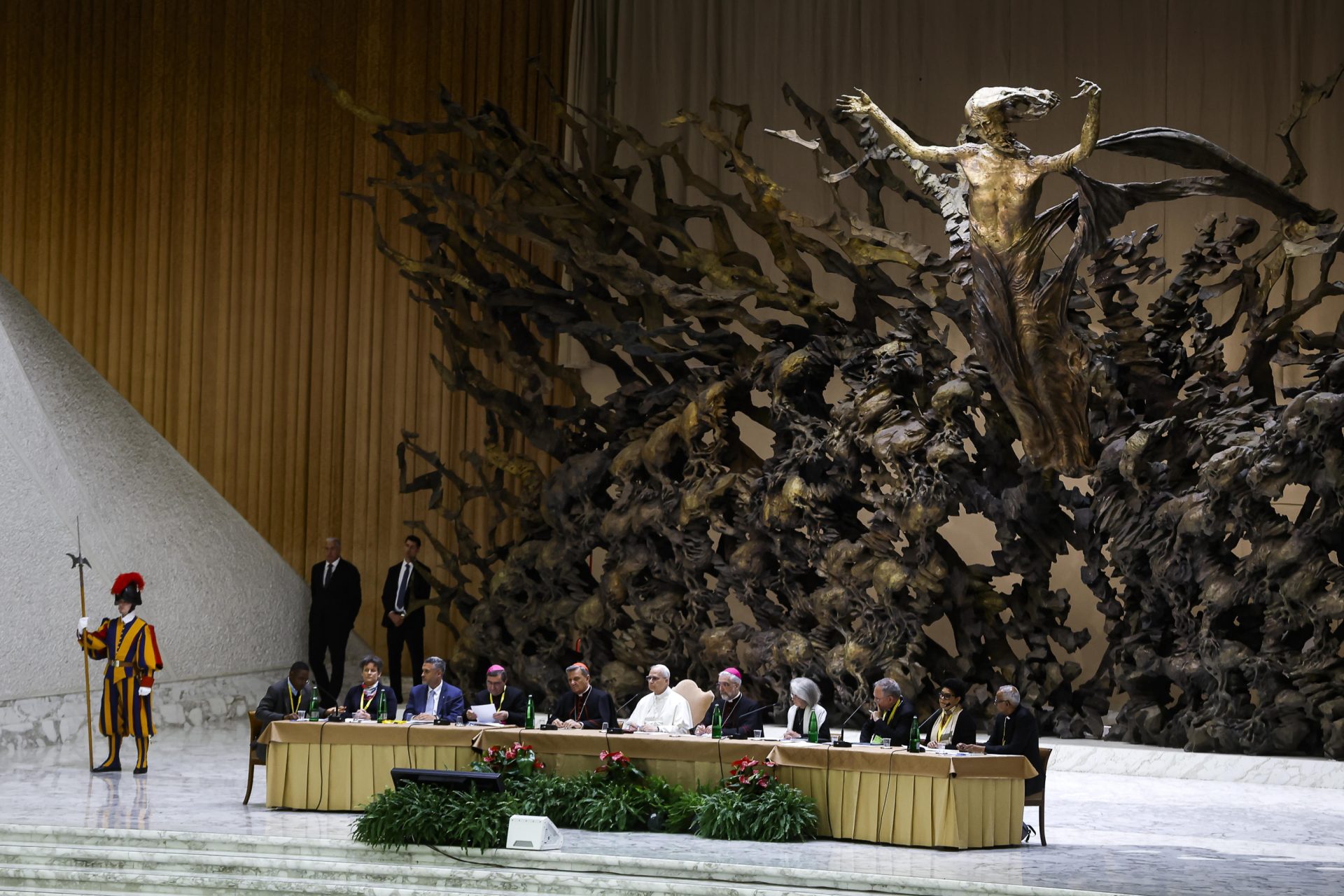 Depois da sessão de abertura, o Papa chegou ao Auditório Paulo VI para um encontro-diálogo, com representantes de sete regiões eclesiais de todo o mundo, que apresentaram desafios sobre a implementação da sinodalidade,