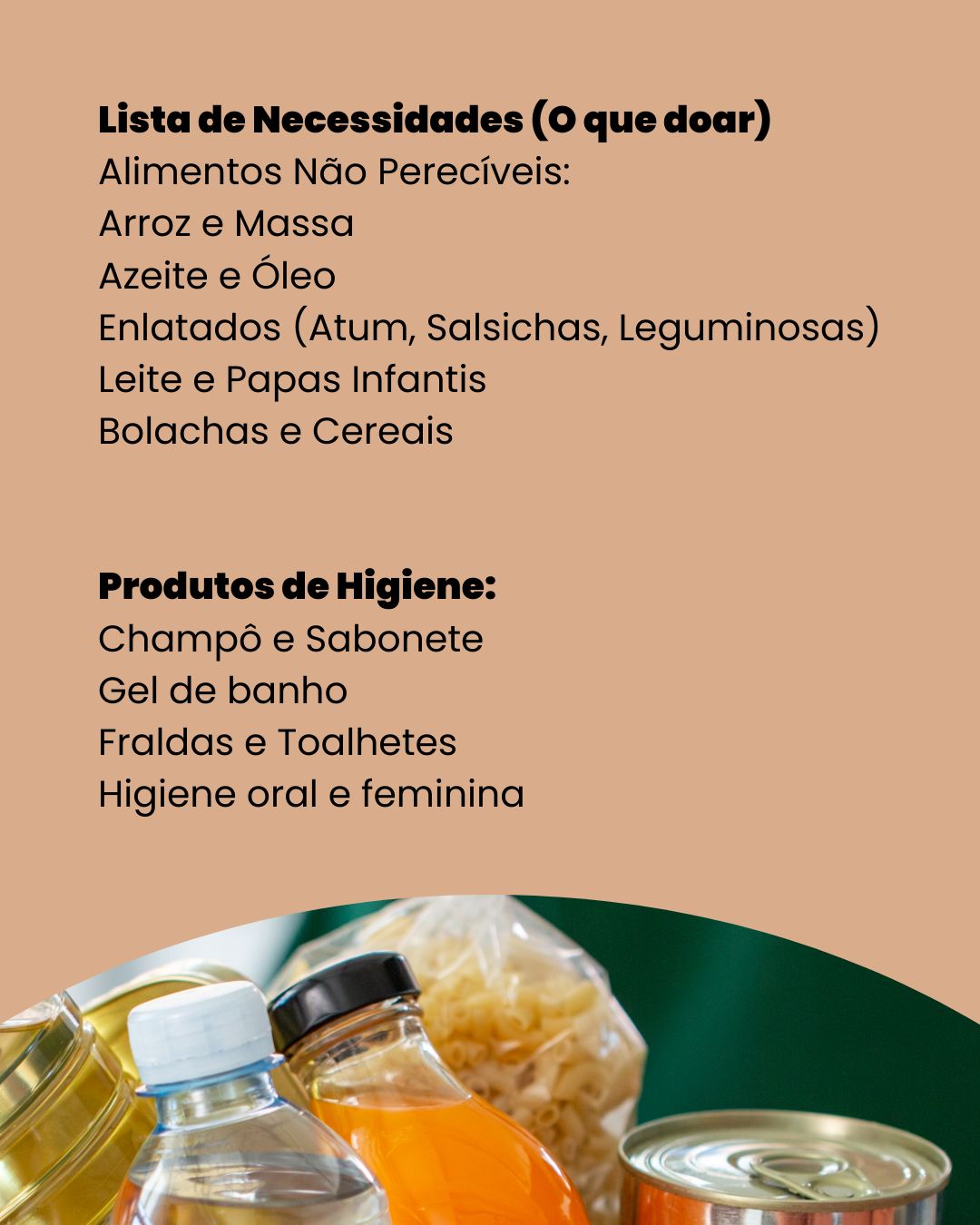 Entre o bens prioritários encontram-se alimentos não perecíveis: arroz e massa; azeite e óleo; enlatados, como atum, salsichas, leguminosas; leite e papas infantis, bolachas e cereais.