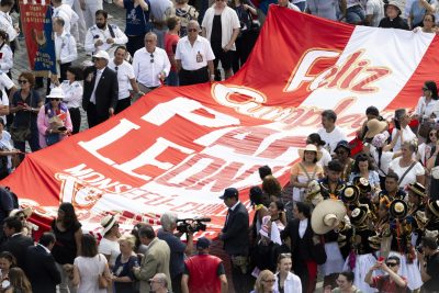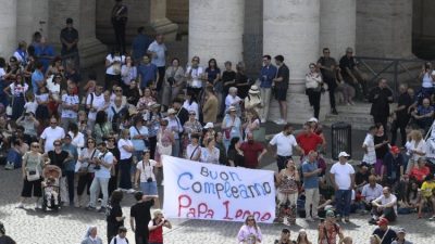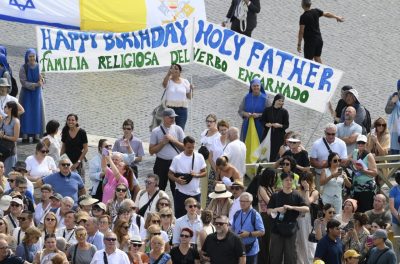 Milhares de pessoas, reunidas na Praça de São Pedro, uniram-se num enorme coro para cantar os “parabéns” ao Papa, acompanhados por várias faixas de felicitações.