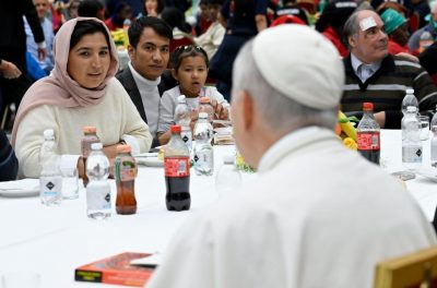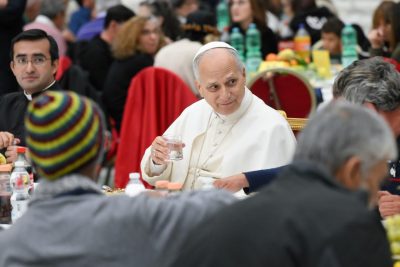 Leão XIV chegou após a recitação do ângelus e sentou-se numa mesa montada no centro, perto do palco, após dirigir-se aos participantes: “É com grande alegria que nos reunimos nesta tarde para este almoço, neste dia tão desejado pelo nosso amado predecessor, o Papa Francisco. Um forte aplauso para o Papa Francisco”.