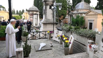 Assim que chegou ao local, o Papa depositou um ramo de rosas brancas sobre um túmulo, numa homenagem simbólica a todos os que estão sepultados no cemitério romano.